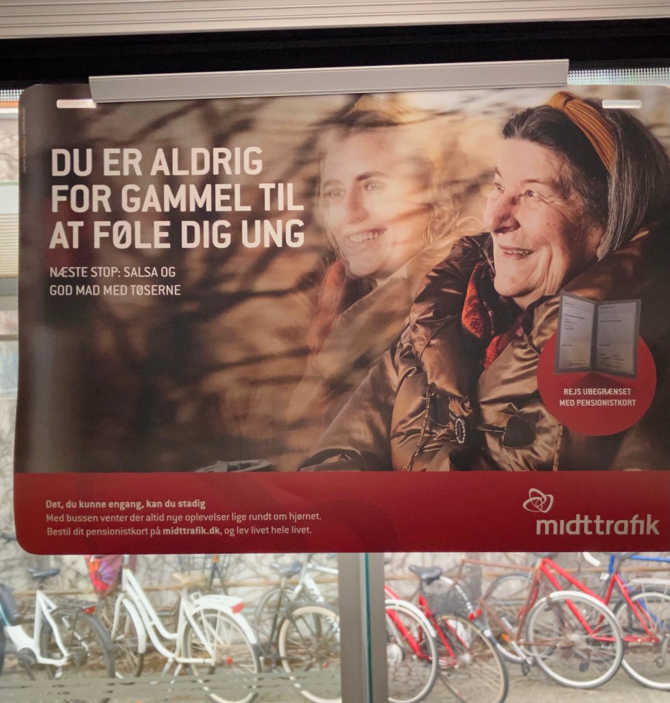 Denne lidt sukkersøde alderisme fandt jeg i min bus. “Du er aldrig for gammel til at føle dig ung” var en flyer for pensionist-kortet fra Midttrafik. Den lå og flød i busserne forleden: ”Med bussen venter der altid nye oplevelser lige rundt om hjørnet.”